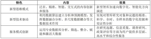 2020年,我國發(fā)布了《關于支持新業(yè)態(tài)新模式健康發(fā)展、激活消費市場帶動擴大就業(yè)的意見》《關于推進“上云用數(shù)賦智”行動培育新經濟發(fā)展實施方案》等文件,部署了新消費經濟領域的重點任務。 為了適應數(shù)字時代的迅速發(fā)展,智庫也在積極進行數(shù)字化轉型。相對傳統(tǒng)智庫而言,數(shù)字智庫在思維模式創(chuàng)新、新型技術驅動、服務模式創(chuàng)新方面具有優(yōu)勢與特色,見表1。 表1 數(shù)字智庫的優(yōu)勢與特色