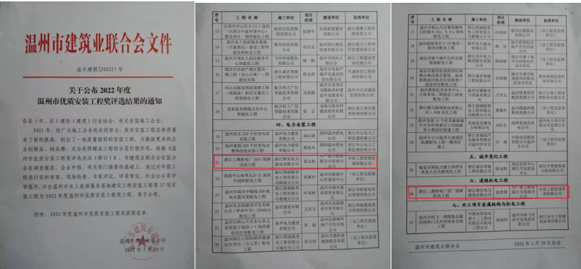 2022年度溫州市優(yōu)質(zhì)安裝工程獎(jiǎng)