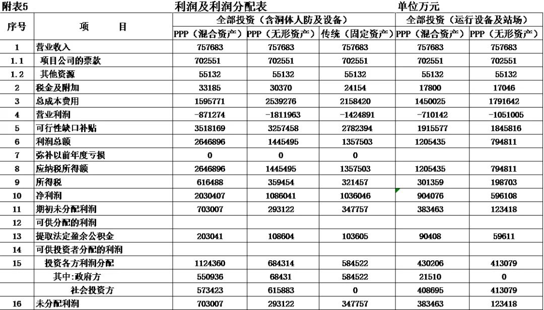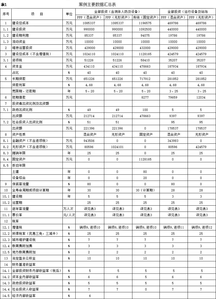 式中,Ct為項(xiàng)目包括投資在內(nèi)的各期費(fèi)用,一般為財(cái)務(wù)分析的投資、經(jīng)營(yíng)成本估算及維持運(yùn)營(yíng)投資,Qt為第t期的產(chǎn)出供應(yīng)消費(fèi)的量,i0為折現(xiàn)率。 2.反推價(jià)格中費(fèi)用取值 反推價(jià)格公式中的費(fèi)用可以利用全部投資現(xiàn)金流量表或資本金現(xiàn)金流量表中的現(xiàn)金流出量。本文推薦在PPP項(xiàng)目中,采用資本金現(xiàn)金流量表中的現(xiàn)金流出計(jì)算反推價(jià)格,原因是資本金財(cái)務(wù)基準(zhǔn)收益率是投資者期望的目標(biāo)收益率,采用資本金現(xiàn)金流出量反推的價(jià)格,計(jì)算的補(bǔ)貼額可直接達(dá)到投資者期望的收益目標(biāo),同時(shí)也可滿(mǎn)足全部投資所得稅后財(cái)務(wù)內(nèi)部收益率指標(biāo)。 3.反推價(jià)格折現(xiàn)率取值 反推價(jià)格折現(xiàn)率取值可以適當(dāng)取值偏高一些,需要反復(fù)試算,選取合理折現(xiàn)率。 方案Ⅰ反推價(jià)格選取按折現(xiàn)率7%,計(jì)算結(jié)果,反推價(jià)格為13.4499元/人次,計(jì)算過(guò)程見(jiàn)表3。 4.可行性缺口補(bǔ)助計(jì)算過(guò)程 (1)反推價(jià)格(P=13.4499元/人.次); (2)利用反推價(jià)格和可研報(bào)告的產(chǎn)品(或服務(wù))數(shù)量計(jì)算達(dá)到目標(biāo)收益率的收入總量,見(jiàn)表3序號(hào)2,計(jì)算票款收入41.22億元(該項(xiàng)收入為原運(yùn)營(yíng)收入和需要補(bǔ)貼收入之和); (3)目標(biāo)收入總量減去原票款收入,計(jì)算需要補(bǔ)貼數(shù)額,見(jiàn)表3序號(hào)3,計(jì)算補(bǔ)貼收入(補(bǔ)貼票款收入與原票款收入之差(2.1-1.1))34.19億元; (4)計(jì)算金融資產(chǎn)保底收入與利息收入之和,見(jiàn)表3序號(hào)4(4.1+4.1)232.39億元; (5)調(diào)整補(bǔ)貼收入,當(dāng)有些年序中補(bǔ)貼票款收入與原票款收入之差小于零時(shí),需要調(diào)整補(bǔ)貼收入,令其補(bǔ)貼收入等于當(dāng)年的金融資產(chǎn)保底收入與利息收入之和,見(jiàn)表3序號(hào)5,9.9億元; (6)補(bǔ)貼收入,見(jiàn)表3序號(hào)6,351.82億元。 (三)財(cái)務(wù)分析指標(biāo)匯總 各方案可行性缺口補(bǔ)貼及評(píng)價(jià)指標(biāo)匯總見(jiàn)表5。 (四)政府收支現(xiàn)金流量分析 政府收支現(xiàn)金流量表見(jiàn)表6。 (五)五方案數(shù)據(jù)對(duì)比分析的兩點(diǎn)啟示 數(shù)據(jù)對(duì)比分析結(jié)果的啟示: 啟示一:采用PPP模式要合理界定項(xiàng)目的范圍?;A(chǔ)設(shè)施項(xiàng)目投資結(jié)構(gòu)中純公益性設(shè)施投資占有較大比重的項(xiàng)目不適宜將全部投資納入PPP模式,建議將純公益性設(shè)施與運(yùn)營(yíng)設(shè)施分開(kāi)處理,兩部分投資可選擇不同的運(yùn)作模式。 第一組案例,PPP模式方案Ⅰ和方案Ⅱ與政府自建的傳統(tǒng)模式方案Ⅲ相比: 方案Ⅰ和方案Ⅱ根據(jù)特許經(jīng)營(yíng)協(xié)議規(guī)定的績(jī)效考核標(biāo)準(zhǔn),兩方案投資、經(jīng)營(yíng)成本及更新改造投資均比傳統(tǒng)模式政府自建成本節(jié)約10%左右。表5財(cái)務(wù)指標(biāo)計(jì)算結(jié)果可行性缺口補(bǔ)貼,方案Ⅰ為351.82億元,方案Ⅱ?yàn)?25.75萬(wàn)元,方案Ⅲ為278.24億元。方案Ⅲ比方案Ⅰ節(jié)約73.43億元,比方案Ⅱ節(jié)約47.51億元。表6政府現(xiàn)金收支流量分析結(jié)果,方案Ⅲ政府收支凈現(xiàn)值(ic=5%)為最小-23.69億元,比方案Ⅰ-35.71億元,減少12.02億元, 比方案Ⅱ-58.64億元,減少34.95億元。 為什么傳統(tǒng)模式方案Ⅲ在投資規(guī)模、經(jīng)營(yíng)成本、更新改造投資均高出兩方案10%左右的情況下,而財(cái)務(wù)指標(biāo)優(yōu)于PPP模式?主要原因有兩個(gè): 一是,地鐵項(xiàng)目投資結(jié)構(gòu)分為兩部分,洞體工程為地鐵運(yùn)營(yíng)提供了運(yùn)輸空間,屬于純公益性質(zhì),且投資占比在60%左右,而投資占比40%左右的營(yíng)運(yùn)設(shè)施,則屬于經(jīng)營(yíng)性。在傳統(tǒng)項(xiàng)目實(shí)施方案中洞體及人防土建工程按80-100年提取折舊,在25年內(nèi)固定資產(chǎn)提取折舊57.89億元,回收固定資產(chǎn)余值54.93億元。而選擇PPP模式時(shí),洞體及人防建設(shè)成本在25年項(xiàng)目公司全部回收,顯然運(yùn)營(yíng)期增加了政府補(bǔ)貼額。 二是,政府自建模式方案Ⅲ,不存在對(duì)社會(huì)資本補(bǔ)貼收益的支出。政府自建模式的缺點(diǎn)是初始投資大,建設(shè)及運(yùn)營(yíng)風(fēng)險(xiǎn)全部由政府承擔(dān)。 啟示二:確認(rèn)PPP模式資產(chǎn)性質(zhì)、設(shè)置保底量及合理分擔(dān)政府與社會(huì)投資人的風(fēng)險(xiǎn),直接影響可行性缺口補(bǔ)貼的計(jì)算結(jié)果。 第一組案例是全部投資(含洞體及人防工程投資)條件下的PPP模式,方案Ⅰ為混合資產(chǎn),方案Ⅱ?yàn)闊o(wú)形資產(chǎn)(不再詳述)。 第二組案例扣除洞體及人防工程投資,方案Ⅳ混合資產(chǎn),方案Ⅴ無(wú)形資產(chǎn)。以下本文重點(diǎn)分析第二組方案PPP模式方案Ⅳ混合資產(chǎn)定性的過(guò)程。 方案Ⅳ和方案Ⅴ是扣除洞體及人防土建工程投資的PPP項(xiàng)目,項(xiàng)目總投資42.46億元,資本金18.79億元,政府出資5%,為0.93億元,社會(huì)出資人出資95%,為17.85億元。方案Ⅳ資產(chǎn)性質(zhì)為混合資產(chǎn),方案Ⅴ資產(chǎn)性質(zhì)為無(wú)