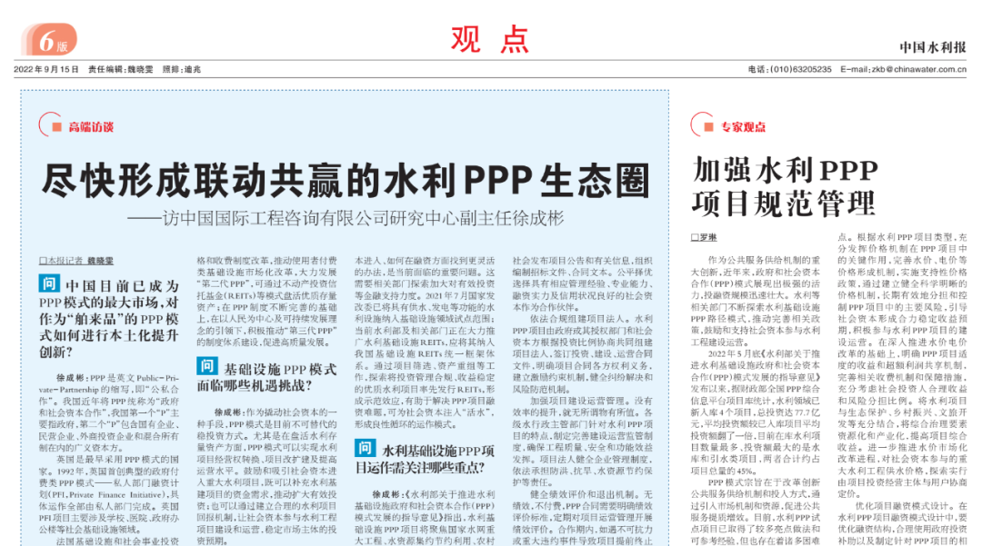 注:原文載自《中國(guó)水利報(bào)》2022年9月15日高端訪談:盡快形成聯(lián)動(dòng)共贏的水利PPP生態(tài)圈——訪中國(guó)國(guó)際工程咨詢有限公司研究中心副主任徐成彬(《中國(guó)水利報(bào)》記者 魏曉雯)