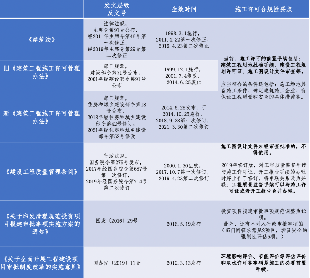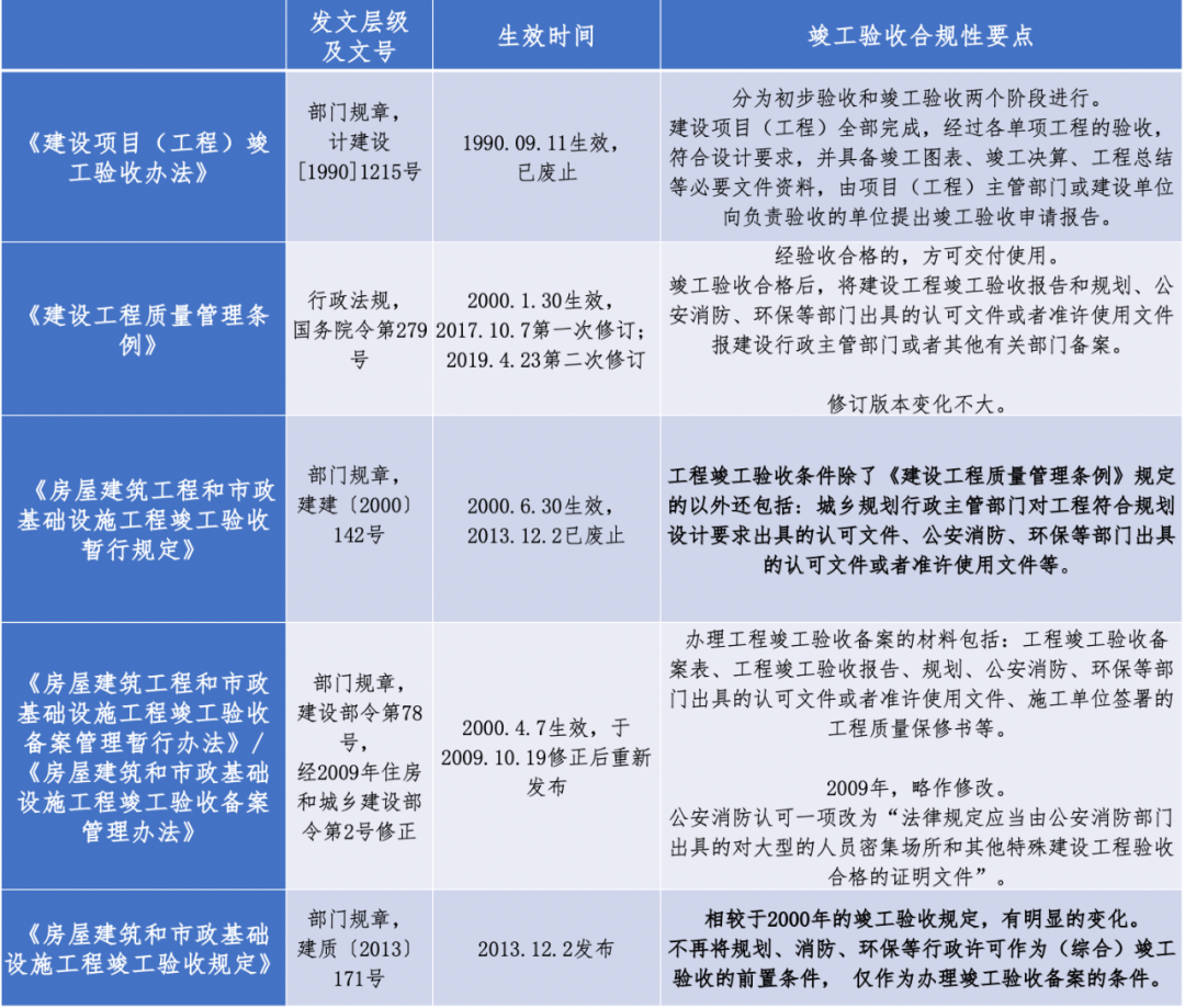 編者按 新中國成立以來,我國基礎(chǔ)設(shè)施投資建設(shè)取得了舉世矚目的成就,是國家經(jīng)濟(jì)社會發(fā)展的重要支撐,為人民生活水平的提高做出了巨大貢獻(xiàn)。改革開放以來,市場開始發(fā)揮配置資源的決定性作用,為我國基礎(chǔ)設(shè)施的發(fā)展煥發(fā)了新的活力。據(jù)統(tǒng)計(jì),我國基礎(chǔ)設(shè)施資產(chǎn)總規(guī)模在1990年排在全世界約第15位,2000年上升到第7位,2010年躍升為第3位,至2018年已居世界首位。 黨的二十大報(bào)告在回顧過去五年的工作和新時代十年的偉大變革中,充分肯定了基礎(chǔ)設(shè)施在經(jīng)濟(jì)社會中發(fā)揮的重要作用。報(bào)告指出,我國“建成世界最大的高速鐵路網(wǎng)、高速公路網(wǎng),機(jī)場港口、水利、能源、信息等基礎(chǔ)設(shè)施建設(shè)取得重大成就”。我國基礎(chǔ)設(shè)施多年來大規(guī)模的投資建設(shè)和存量資產(chǎn)的高速積累,是黨中央、國務(wù)院在建立社會主義市場經(jīng)濟(jì)體制背景下,關(guān)于投融資體制改革部署的重要成果。 項(xiàng)目前期工作手續(xù)的合規(guī)性要求,是基礎(chǔ)設(shè)施能夠發(fā)揮其應(yīng)有價值的重要前提,也是投融資體制改革關(guān)注的重點(diǎn)內(nèi)容之一。伴隨著政府職能轉(zhuǎn)變、深化“放管服”改革和擴(kuò)大有效投資等重大決策的關(guān)鍵部署,我國工程建設(shè)項(xiàng)目審批制度不斷優(yōu)化和改革,基礎(chǔ)設(shè)施項(xiàng)目投資前期決策管理經(jīng)歷了復(fù)雜的演變進(jìn)程,其合規(guī)性標(biāo)準(zhǔn)也在與時俱進(jìn)、不斷完善。當(dāng)前我國已進(jìn)入基礎(chǔ)設(shè)施存量時代,存量資產(chǎn)項(xiàng)目前期工作手續(xù)的合規(guī)性是重要的盤活條件之一,部分合規(guī)性問題已成為新時代社會廣泛關(guān)注的焦點(diǎn)。本項(xiàng)專題研究立足投融資體制和項(xiàng)目審批制度變革的歷史背景,嘗試?yán)迩寤A(chǔ)設(shè)施項(xiàng)目在立項(xiàng)、土地、規(guī)劃、環(huán)境、建設(shè)施工等方面主要前期工作的歷史變革脈絡(luò),梳理不同管理事項(xiàng)之間的邏輯關(guān)聯(lián),從這一視角提供基礎(chǔ)設(shè)施項(xiàng)目前期工作手續(xù)的合規(guī)性認(rèn)識。本公眾號將研究報(bào)告的部分成果以系列文章的形式陸續(xù)刊發(fā),研究報(bào)告第一部分為背景與立項(xiàng)篇,第二部分為土地與規(guī)劃篇,本文是系列研究報(bào)告的第三部分(建設(shè)施工篇),供業(yè)界同仁參考。 基礎(chǔ)設(shè)施項(xiàng)目前期工作手續(xù)合規(guī)性研究(Ⅲ) 張雪飛 伍迪 摘要:開工和竣工是基礎(chǔ)設(shè)施項(xiàng)目建設(shè)施工方面的重要工作節(jié)點(diǎn),依法合規(guī)開展有關(guān)工作是項(xiàng)目的合規(guī)性前提。建筑工程施工許可證(或開工報(bào)告)是建筑施工單位符合施工條件、允許開工的批準(zhǔn)文件,是建設(shè)單位進(jìn)行工程施工的法律憑證,是工程項(xiàng)目由實(shí)施準(zhǔn)備轉(zhuǎn)向施工建設(shè)、由藍(lán)圖設(shè)計(jì)變成項(xiàng)目實(shí)體的重要工作手續(xù)??⒐を?yàn)收是建設(shè)工程項(xiàng)目竣工后,全面考核建設(shè)工作、檢查是否符合設(shè)計(jì)要求和工程質(zhì)量的重要環(huán)節(jié),是工程項(xiàng)目由施工建設(shè)走向運(yùn)營投產(chǎn),是建設(shè)投資成果轉(zhuǎn)入交付使用的關(guān)鍵工作事項(xiàng)。本文聚焦基礎(chǔ)設(shè)施項(xiàng)目建設(shè)施工方面的手續(xù),尤其對施工許可和竣工驗(yàn)收兩方面的主要內(nèi)容和制度演進(jìn)進(jìn)行系統(tǒng)梳理,供業(yè)界參考。 關(guān)鍵詞:基礎(chǔ)設(shè)施;合規(guī)性;施工許可;竣工驗(yàn)收;政策演進(jìn) 一、施工許可手續(xù)合規(guī)性 (一)內(nèi)涵與適用范圍 建筑工程施工許可證是建筑施工單位符合施工條件、允許開工的批準(zhǔn)文件,是建設(shè)單位進(jìn)行工程施工的法律憑證。根據(jù)有關(guān)法律政策規(guī)定,在中華人民共和國境內(nèi)從事各類房屋建筑及其附屬設(shè)施的建造、裝修裝飾和與其配套的線路、管道、設(shè)備的安裝,以及城鎮(zhèn)市政基礎(chǔ)設(shè)施工程的施工,建設(shè)單位在開工前應(yīng)當(dāng)向工程所在地縣級以上人民政府建設(shè)行政主管部門申請領(lǐng)取施工許可證,國務(wù)院建設(shè)行政主管部門確定的限額以下的小型工程除外。具體而言,對于工程投資額在30萬元以下或者建筑面積在300平方米以下的建筑工程,可以不申請辦理施工許可證。各省、自治區(qū)、直轄市人民政府住房城鄉(xiāng)建設(shè)主管部門可以根據(jù)當(dāng)?shù)氐膶?shí)際情況,對限額進(jìn)行調(diào)整,并報(bào)國務(wù)院住房城鄉(xiāng)建設(shè)主管部門備案。按照國務(wù)院規(guī)定的權(quán)限和程序批準(zhǔn)開工報(bào)告的建筑工程,不再領(lǐng)取施工許可證。 辦理施工許可證有關(guān)事項(xiàng)應(yīng)主要以《中華人民共和國建筑法》(以下簡稱《建筑法》)和《建筑工程施工許可管理辦法》等法規(guī)政策為依據(jù)。根據(jù)最新修訂且現(xiàn)行有效的2019年版《建筑法》和2021年版《建筑工程施工許可管理辦法》,申請領(lǐng)取施工許可證,應(yīng)當(dāng)符合的條件
