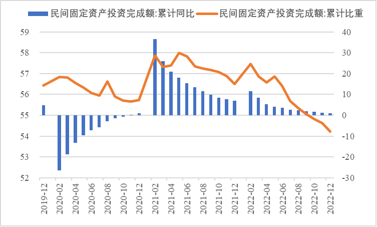 2022年,面對復雜嚴峻的國際環(huán)境和國內(nèi)疫情挑戰(zhàn),我國投資整體表現(xiàn)較強韌性,對穩(wěn)定經(jīng)濟基本盤發(fā)揮了壓艙石作用?;A設施和部分制造業(yè)成為穩(wěn)投資的重點領域,中西部地區(qū)投資增長動能強勁。同時,制造業(yè)承壓加劇、房地產(chǎn)投資下行、地方債高壓、社融需求走弱等突出問題制約投資持續(xù)穩(wěn)定增長,穩(wěn)投資壓力仍然較大。做好2023年投資促進工作,關鍵是把擴大有效投資同優(yōu)化供給結構有機結合起來,持續(xù)擴大高技術產(chǎn)業(yè)投資,多舉措穩(wěn)定房地產(chǎn)投資,更好發(fā)揮政府投資的引導作用,充分釋放社會投資需求潛能。 一、固定資產(chǎn)投資整體運行情況 (一)整體投資韌性超出預期,民間投資呈下行趨勢 2022年1—12月,我國固定資產(chǎn)投資(不含農(nóng)戶,下同)572138億元,同比增長5.1%。一季度投資增速達到9.3%的年內(nèi)高點,上半年、前三季度分別降至6.1%、5.9%,年初投資增速較高的重要原因是2022年專項債部分限額提前下達等系列政策發(fā)揮效果,之后受國外地緣政治沖突、國內(nèi)疫情多點散發(fā)等因素影響,投資增速有所下降,但降幅逐季收窄。一季度、上半年、前三季度、全年固定資產(chǎn)投資增速分別較同期國內(nèi)生產(chǎn)總值增速高了4.5個、3.6個、2.9個和2.1個百分點,投資成為當前穩(wěn)定宏觀經(jīng)濟大盤的關鍵力量。 圖1 全國固定資產(chǎn)投資增速 (累計同比,%) 數(shù)據(jù)來源:國家統(tǒng)計局 1—12月,我國固定資產(chǎn)投資三年平均增速為4.3%,低于2019年同期1.1個百分點,全面恢復到疫情前水平仍需一定時間。尤其是民間投資受疫情沖擊較為嚴重,復蘇難度較大。一季度、上半年、前三季度、全年民間投資分別同比增長8.4%、3.5%、2%、0.9%,低于整體投資增速0.9個、2.6個、3.9個、4.2個百分點,與整體投資增速的差距逐季拉大。從占比看,截至12月底民間投資累計占固定資產(chǎn)投資的比重已降至54.2%,低于2019年同期2.2個百分點。 圖2 民間投資增速及占比(%) 數(shù)據(jù)來源:國家統(tǒng)計局,Wind數(shù)據(jù)庫 (二)基礎設施、制造業(yè)投資支撐作用明顯,房地產(chǎn)市場持續(xù)低迷 制造業(yè)投資在外需帶動和政策支撐下展現(xiàn)較強韌性,2022年1—12月制造業(yè)投資同比增長9.1%,比整體投資高4個百分點。在內(nèi)需受疫情影響明顯收縮的情況下,制造業(yè)投資超預期增長很大程度上得益于外需對出口的拉動。我國全年貨物出口額累計同比增長10.5%,裝備制造、消費品制造等領域海外訂單持續(xù)旺盛,機電產(chǎn)品占進出口總額的49.1%,汽車出口大幅增長82.2%。技改投資繼續(xù)發(fā)揮對制造業(yè)投資的拉動作用。1—11月,制造業(yè)企業(yè)技改投資同比增長9.1%,占全部制造業(yè)投資的比重達40.9%。 基礎設施投資在增加政策性開發(fā)性金融工具額度、用好專項債等融資支持政策以及各地區(qū)各部門積極貫徹落實穩(wěn)增長系列政策推動下,連續(xù)8個月回升,1—12月同比增長9.4%,高于全部投資增速4.3個百分點。其中,水利管理業(yè)投資和公共設施管理業(yè)投資分別大幅增長13.6%、10.1%。 表1 1-12月我國各行業(yè)固定資產(chǎn)投資情況 2022年受需求走弱影響,房地產(chǎn)開發(fā)投資增速持續(xù)放緩,一季度僅同比增長0.7%,二季度開始滑落至負增長區(qū)間。1—12月我國房地產(chǎn)開發(fā)投資同比下降10%,降幅較前三季度、上半年分別擴大2個、4.6個百分點,跌幅持續(xù)加深,拖累固定資產(chǎn)投資整體增長。房企土地購置費、施工面積、新開工面積等指標均出現(xiàn)持續(xù)大幅下降。1—12月,房地產(chǎn)開發(fā)景氣指數(shù)均位于100以下,且自2月以來持續(xù)走低。 圖3 三大領域固定資產(chǎn)投資增速 (累計同比,%) 數(shù)據(jù)來源:國家統(tǒng)計局,Wind數(shù)據(jù)庫 高技術產(chǎn)業(yè)投資引領作用持續(xù)增強。在投資整體下行壓力加大的情況下,高技術產(chǎn)業(yè)投資逆勢而上,穩(wěn)投資引領作用持續(xù)顯現(xiàn)。2022年高技術產(chǎn)業(yè)投資同比增長18.9%,比全部投資增速高13.8個百分點。分類別看,高技術制造業(yè)投資同比增長22.2%,比制造業(yè)整體投資高了13.1個百分點,其中電子及通信設備制造業(yè)投資增長27.2%,醫(yī)療儀器設備及儀器儀表制造業(yè)投資增長27.6%,電子、醫(yī)藥制造業(yè)投資大幅增加;高技術服務業(yè)投資同比增長12.1%,其中科技成果轉化服務業(yè)投資增長26.4%,研發(fā)設計服務業(yè)投資增長19.8%,企業(yè)研發(fā)投入顯著加大。 圖4 高技術產(chǎn)業(yè)投資增速對比整體投資增速 (累計同比,%) 數(shù)據(jù)來源:國家統(tǒng)計局,Wind數(shù)據(jù)庫 (三)中西部地區(qū)投資增長動力較強,東北地區(qū)增速止跌回升 2022年1—12月,東部地區(qū)投資同比增長3.6%,較前三季度、上半年、一季度分別回落0.7個、0.9個、5.9個百分點;中部地區(qū)投資增長8.9%,較前三季度、上半年、一季度分別回落1.1個、1.8個、5.5個百分點;西部地區(qū)投資增長4.7%,較前三季度、上半年、一季度分別回落2個、3.3個、6.6個百分點;東北地區(qū)投資增長1.2%,較前三季度、上半年、一季度分別提升1個、2.1個、2.6個百分點??偟膩砜矗胁亢臀鞑康貐^(qū)投資保持較快增長,東部地區(qū)增速較低,東