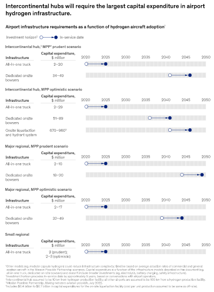 隨著對解決航空業(yè)氣候影響的解決方案的尋求變得更加迫切,人們對例如氫氣、電池電力和混合電力驅動飛機等新型推進技術產生了極大的興趣。根據(jù)MPP對航空業(yè)能源的估計,到2050年,電池電力和氫動力飛機可能占所有飛機的21%-38%,占該行業(yè)整體能源需求的15%-34%。雖然時間上可能感覺很遙遠,但這一新技術將在這十年內出現(xiàn)。 針對這些基礎設施的變化,以及機場和其他利益相關方如何開始準備,仍存在不確定性。近期,麥肯錫發(fā)布了《瞄準低碳:為電池和氫動力飛機提供基礎設施》的報告,旨在幫助人們了解影響新型推進器的一些關鍵考慮因素。