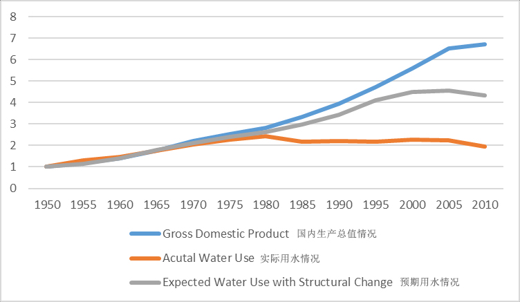 編者按:《2021年聯(lián)合國(guó)世界水發(fā)展報(bào)告》提出,全球新水使用量在過(guò)去100年中增加了6倍,自20世紀(jì)80年代以來(lái)以每年約1%的速度增加。預(yù)計(jì)至2050年全球用水量仍將以類似的速度繼續(xù)增長(zhǎng),且增長(zhǎng)主要集中在中低收入國(guó)家,尤其是新興經(jīng)濟(jì)體[1]。 為進(jìn)一步把握好我國(guó)水資源未來(lái)需求趨勢(shì),我們深入分析研究了一些典型國(guó)家的用水態(tài)勢(shì)變化情況及水資源管理經(jīng)驗(yàn),以期為我國(guó)做好水資源需求研判以及科學(xué)指導(dǎo)水工程規(guī)劃建設(shè)提供參考。本公眾號(hào)將研究成果以系列文章的方式陸續(xù)刊發(fā),本文為系列研究之一,供業(yè)界同仁參考。 美國(guó)用水變化態(tài)勢(shì)對(duì)我國(guó)的啟示 姜富華 邢智慧 紀(jì)興華 一、1950年以來(lái)美國(guó)用水量變化態(tài)勢(shì)分析 (一)1950年以來(lái)美國(guó)用水量變化情況 2015年美國(guó)總用水量約為4449億立方米,其中淡水約為3883億立方米,占比為87%;咸水約為566億立方米,占比為13%。 從1950年至2015年間美國(guó)總用水量的變化情況看,其總體呈先增后降的態(tài)勢(shì)(見(jiàn)圖1)。以1980年為轉(zhuǎn)折點(diǎn),1950-1980年間美國(guó)總用水量隨著人口和經(jīng)濟(jì)的增長(zhǎng)持續(xù)增長(zhǎng),1980年美國(guó)總用水量約為1950年的2.4倍;1980年以后,受產(chǎn)業(yè)結(jié)構(gòu)調(diào)整、技術(shù)進(jìn)步、用水效率提高等因素綜合影響,美國(guó)總用水量呈現(xiàn)了總體下降的態(tài)勢(shì),2015年總用水量比用水高峰的1980年減少了約25%。 美國(guó)淡水取用量與總用水量變化態(tài)勢(shì)一致(見(jiàn)圖2)。1980-2015年間美國(guó)淡水總用水量下降了27%,此期間美國(guó)人口增長(zhǎng)了約42%,GDP增長(zhǎng)了5倍以上[2]。 數(shù)據(jù)來(lái)源:美國(guó)地質(zhì)調(diào)查局統(tǒng)計(jì)。 注:①不同時(shí)段取水量統(tǒng)計(jì)口徑略有差異;②取水量等于毛用水量。 圖1 1950-2015年美國(guó)總?cè)∮盟考胺诸惾∮盟孔兓瘧B(tài)勢(shì) 數(shù)據(jù)來(lái)源:美國(guó)地質(zhì)調(diào)查局統(tǒng)計(jì)。 圖2 1950-2015年美國(guó)淡水取用水量與人口變化態(tài)勢(shì) 有研究[3]繪制了以1950年為基準(zhǔn),至2010年美國(guó)GDP與用水量間的關(guān)系變化情況圖(見(jiàn)圖3)。藍(lán)色線為實(shí)際GDP變化,橙色線為實(shí)際用水量變化,灰色線為考慮產(chǎn)業(yè)結(jié)構(gòu)變化、不考慮技術(shù)改進(jìn)情況下的預(yù)測(cè)用水變化。藍(lán)色線與橙色線的剪刀走向表明:早在1980年,美國(guó)用水量已與GDP脫鉤。藍(lán)色線與灰色線、灰色線與橙色線的剪刀走向表明:導(dǎo)致脫鉤的重要因素是用水效率提升和經(jīng)濟(jì)結(jié)構(gòu)變化。 數(shù)據(jù)來(lái)源:數(shù)據(jù)來(lái)自[3];1950=1 圖3 1950-2010年美國(guó)總用水量與經(jīng)濟(jì)變化關(guān)系分析 (二)主要行業(yè)用水量變化情況 美國(guó)用水類別中,熱電、灌溉、公共和自供工業(yè)用水量是排在前4名的用水戶,其用水總量占美國(guó)總用水量的比重超過(guò)90%,見(jiàn)圖4。本文重點(diǎn)分析多年來(lái)美國(guó)熱電、灌溉、公共和自供工業(yè)用水的變化情況。 數(shù)據(jù)來(lái)源:美國(guó)地質(zhì)調(diào)查局。 圖4 2015年美國(guó)分類取用水量統(tǒng)計(jì) 1.熱電用水變化態(tài)勢(shì) 熱電是美國(guó)最大的用水對(duì)象。2015年美國(guó)熱電用水量約為1838億立方米,占總用水量的41%左右,見(jiàn)圖5。美國(guó)熱電用水基本來(lái)自地表水,且以淡水為主。2015年美國(guó)熱電用水量比2010年降低18%左右,用水效率由2010年的71.9升/千瓦時(shí)降低到2015年的56.8升/千瓦時(shí)。 數(shù)據(jù)來(lái)源:美國(guó)地質(zhì)調(diào)查局。 圖5 1950-2015年美國(guó)熱電用水量變化態(tài)勢(shì) 2.灌溉用水變化態(tài)勢(shì) 美國(guó)灌溉用水量占總用水量的40%左右,僅次于熱電用水。2015年美國(guó)灌溉面積超過(guò)3.5億畝,其中噴灌、微灌面積比重分別為55%和8.6%左右,灌溉總用水量約為1630億立方米(占總用水量的37%左右),地表和地下水源灌溉供水比重分別為52%和48%。由于降雨豐枯變化,美國(guó)灌溉水量年際間有波動(dòng),但從大的變化趨勢(shì)看,1980年以來(lái)總體呈下降趨勢(shì),2015年灌溉水量比1980年減少了21%,見(jiàn)圖6。 數(shù)據(jù)來(lái)源:美國(guó)地質(zhì)調(diào)查局。 圖6 1950-2015年美國(guó)灌溉用水量變化態(tài)勢(shì) 灌溉用水受水資源條件、灌溉面積、種植結(jié)構(gòu)、灌溉設(shè)施、灌溉效率等多種因素影響。據(jù)美國(guó)農(nóng)業(yè)部統(tǒng)計(jì),美國(guó)灌溉面積快速增長(zhǎng),從1890年的不足1821萬(wàn)畝增長(zhǎng)到2017年的3.52億畝左右,見(jiàn)圖7。但與此同時(shí),實(shí)際灌溉用水強(qiáng)度有所下降,1969-2017年單位面積平均灌溉水量從406立方米/畝下降至304立方米/畝,這是農(nóng)業(yè)種植模式調(diào)整、灌溉設(shè)施與技術(shù)采用和灌溉效率提高等綜合作用的結(jié)果。 數(shù)據(jù)來(lái)源:美國(guó)農(nóng)業(yè)部。 圖7 1890-2018年美國(guó)灌溉面積和單位面積灌溉用水量變化態(tài)勢(shì) 美國(guó)灌溉用水結(jié)構(gòu)不斷變化,主要表