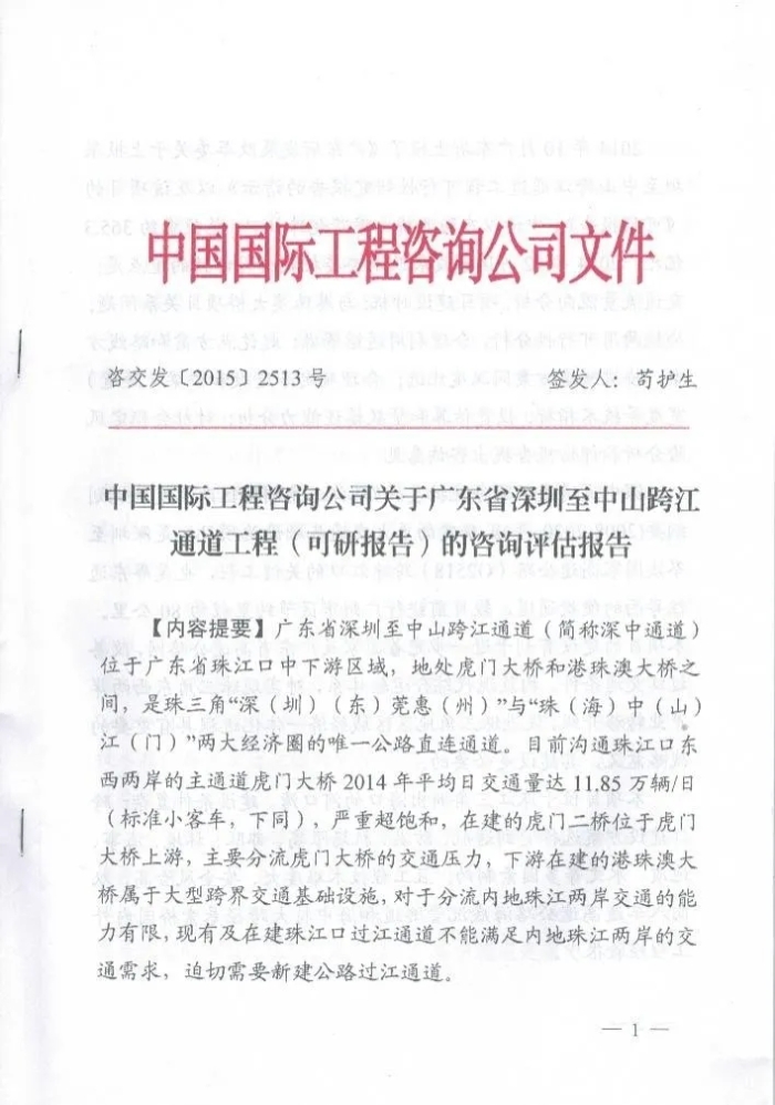 七年磨一劍,鏖戰(zhàn)珠江口。 飛架伶仃洋,天塹變通途。 6月30日,舉世矚目的國(guó)家重大工程深中通道正式建成通車。習(xí)近平總書(shū)記致信祝賀,并向參與規(guī)劃建設(shè)的全體同志致以誠(chéng)摯問(wèn)候。賀信中寫(xiě)道:“深中通道是繼港珠澳大橋后粵港澳大灣區(qū)建成的又一超大型交通工程,攻克了多項(xiàng)世界級(jí)技術(shù)難題,創(chuàng)造了多項(xiàng)世界紀(jì)錄。全體參與者用辛勤付出、堅(jiān)強(qiáng)毅力,高質(zhì)量完成了工程任務(wù)。這充分說(shuō)明,中國(guó)式現(xiàn)代化是干出來(lái)的,偉大事業(yè)都成于實(shí)干!” 全長(zhǎng)約24公里,總投資446億元的深中通道在環(huán)珠江口“A”字形交通主骨架上挺起關(guān)鍵一“橫”,成為全球首個(gè)集“橋、島、隧、水下互通”為一體的跨海集群工程。通車后,深圳至中山的車程從2小時(shí)左右縮短至30分鐘。自此,深中兩地“雙向奔赴”,攜手進(jìn)入“一小時(shí)經(jīng)濟(jì)圈”,廣佛肇、深莞惠、珠中江三大珠三角都市圈聯(lián)結(jié)更加密切,推動(dòng)了粵港澳大灣區(qū)高質(zhì)量發(fā)展加速駛?cè)肟燔嚨馈?/span> 世界最大跨徑(1666米)全離岸海中鋼箱梁懸索橋、世界最高通航凈空高度(76.5米)、世界最大海中錨碇(100萬(wàn)噸)、世界橋梁最高顫振臨界風(fēng)速(88米/秒)……深中通道創(chuàng)造了十多項(xiàng)世界紀(jì)錄,形成了“鋼殼-混凝土沉管隧道設(shè)計(jì)方法”等10項(xiàng)世界領(lǐng)先技術(shù)。獲得發(fā)明專利200余項(xiàng)、行業(yè)協(xié)會(huì)獎(jiǎng)項(xiàng)數(shù)十項(xiàng),并屢獲國(guó)際贊譽(yù):2024年4月,深中大橋榮獲國(guó)際橋梁大會(huì)“喬治·理查德森獎(jiǎng)”,深中隧道入選“全球隧道與地下工程領(lǐng)域50項(xiàng)標(biāo)志性工程”。 這樣一項(xiàng)屢創(chuàng)紀(jì)錄、成于實(shí)干的超級(jí)工程背后,凝結(jié)著上百家參建單位、上萬(wàn)名建設(shè)者的汗水和智慧,中國(guó)國(guó)際工程咨詢有限公司(以下簡(jiǎn)稱“中咨公司”)便是其中一員。作為國(guó)家高端智庫(kù)和國(guó)內(nèi)規(guī)模最大的綜合性工程咨詢機(jī)構(gòu),中咨公司牢記“服務(wù)國(guó)家 貢獻(xiàn)社會(huì)”的初心使命,始終胸懷“國(guó)之大者”,助建“國(guó)之重器”,全程參與深中通道的建設(shè)論證,中咨人攻堅(jiān)克難,勇于擔(dān)當(dāng),敢于創(chuàng)新,用實(shí)際行動(dòng)詮釋了“公正、科學(xué)、可靠、敢言、多謀、慎斷”的中咨精神,為工程保駕護(hù)航,作出了重要貢獻(xiàn)。 使命召喚,責(zé)無(wú)旁貸 深中通道建設(shè)勢(shì)在必行 十年彈指一揮間,不負(fù)韶華不負(fù)己。2014年12月,受國(guó)家發(fā)展改革委委托,中咨公司開(kāi)展《深圳至中山跨江通道可行性研究報(bào)告》(以下簡(jiǎn)稱《可研報(bào)告》)的咨詢?cè)u(píng)估工作,評(píng)估重點(diǎn)包含以下方面:交通流量流向分析;項(xiàng)目建設(shè)時(shí)機(jī);與港珠澳大橋項(xiàng)目關(guān)系問(wèn)題;公鐵兩用可行性分析,合理利用通道資源;起訖點(diǎn)方案和路線方案;橋梁隧道方案同深度比選;合理確定車道數(shù)和橋梁(隧道)寬度等技術(shù)指標(biāo);投資估算和貸款償還能力分析;對(duì)社會(huì)穩(wěn)定風(fēng)險(xiǎn)分析和評(píng)估報(bào)告提出咨詢意見(jiàn)。 使命召喚,責(zé)無(wú)旁貸。中咨公司高度重視深中通道評(píng)估工作,迅速成立組建專班,由時(shí)任中咨公司副總經(jīng)理茍護(hù)生,原交通業(yè)務(wù)部主任佘湘耘,時(shí)任交通業(yè)務(wù)部主任助理姜青春,公路處處長(zhǎng)(項(xiàng)目經(jīng)理)宋小云、公路處申培華、徐進(jìn)、王春苗等,并邀請(qǐng)涵蓋隧道、橋梁、水運(yùn)、鐵路、公路、投資估算等方面專家,共同組成項(xiàng)目組,全力以赴做好評(píng)估論證工作。 2014年12月,中咨公司接受委托開(kāi)展評(píng)估論證工作。 2015年1月,中咨公司組織由工程院士、設(shè)計(jì)等組成的評(píng)估組,在深圳召開(kāi)現(xiàn)場(chǎng)咨詢?cè)u(píng)估會(huì),評(píng)估認(rèn)為本項(xiàng)目的通航安全影響行業(yè)主管部門(mén)尚未批復(fù),現(xiàn)有建設(shè)方案存在很大的不確定性,建議待有關(guān)通航等問(wèn)題明確后,確定工程方案。 2015年8月,交通運(yùn)輸部出具《關(guān)于深圳至中山跨江通道項(xiàng)目航道條件與通航安全影響評(píng)價(jià)的審核意見(jiàn)》(交水函〔2015〕590號(hào)),明確各航道通航凈空和相關(guān)技術(shù)要求。 2015年10月,《可研報(bào)告》編制單位根據(jù)中咨公司咨詢?cè)u(píng)估會(huì)意見(jiàn)和交通運(yùn)輸部關(guān)于通航影響的批復(fù)意見(jiàn),對(duì)交通量預(yù)測(cè)、通航審批執(zhí)行情況、工程實(shí)施范圍、投資估算及經(jīng)濟(jì)評(píng)價(jià)等內(nèi)容進(jìn)行了進(jìn)一步修改完善。 2015年11月,經(jīng)過(guò)評(píng)估組研究并進(jìn)行再次評(píng)估后,中咨公司關(guān)于廣東省深圳至中山跨江通道工程(可研報(bào)告)的咨詢?cè)u(píng)估報(bào)告正式提交國(guó)家發(fā)展改革委。 至此,歷時(shí)近一年的深中通道咨詢?cè)u(píng)估工作順利完成,評(píng)估組從建設(shè)必要性與建設(shè)時(shí)機(jī)、交通量