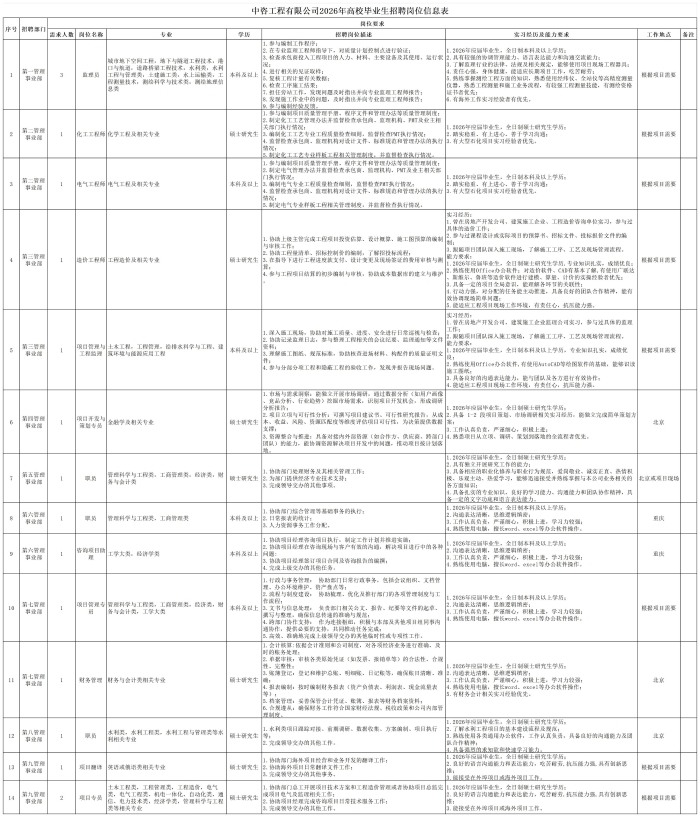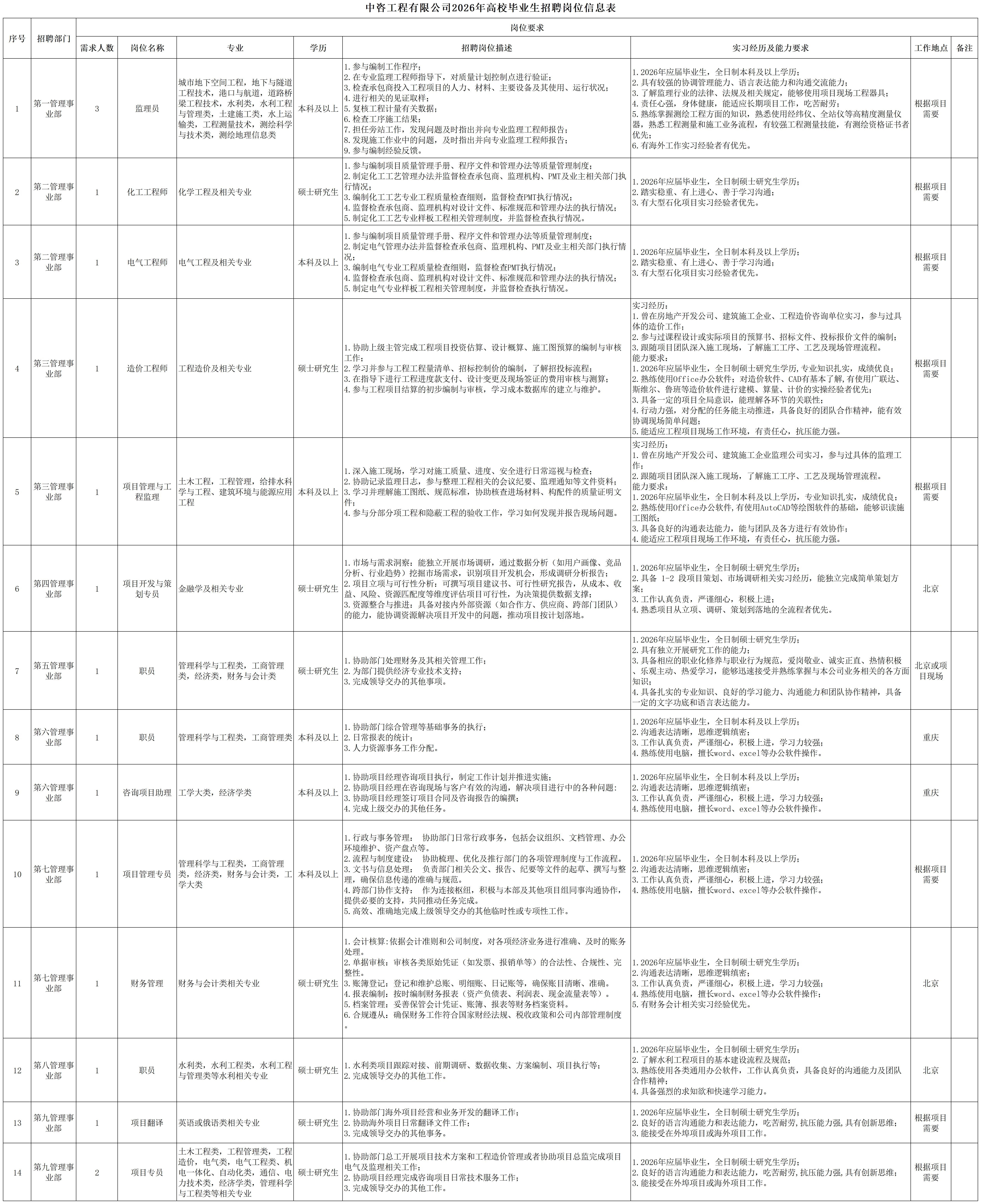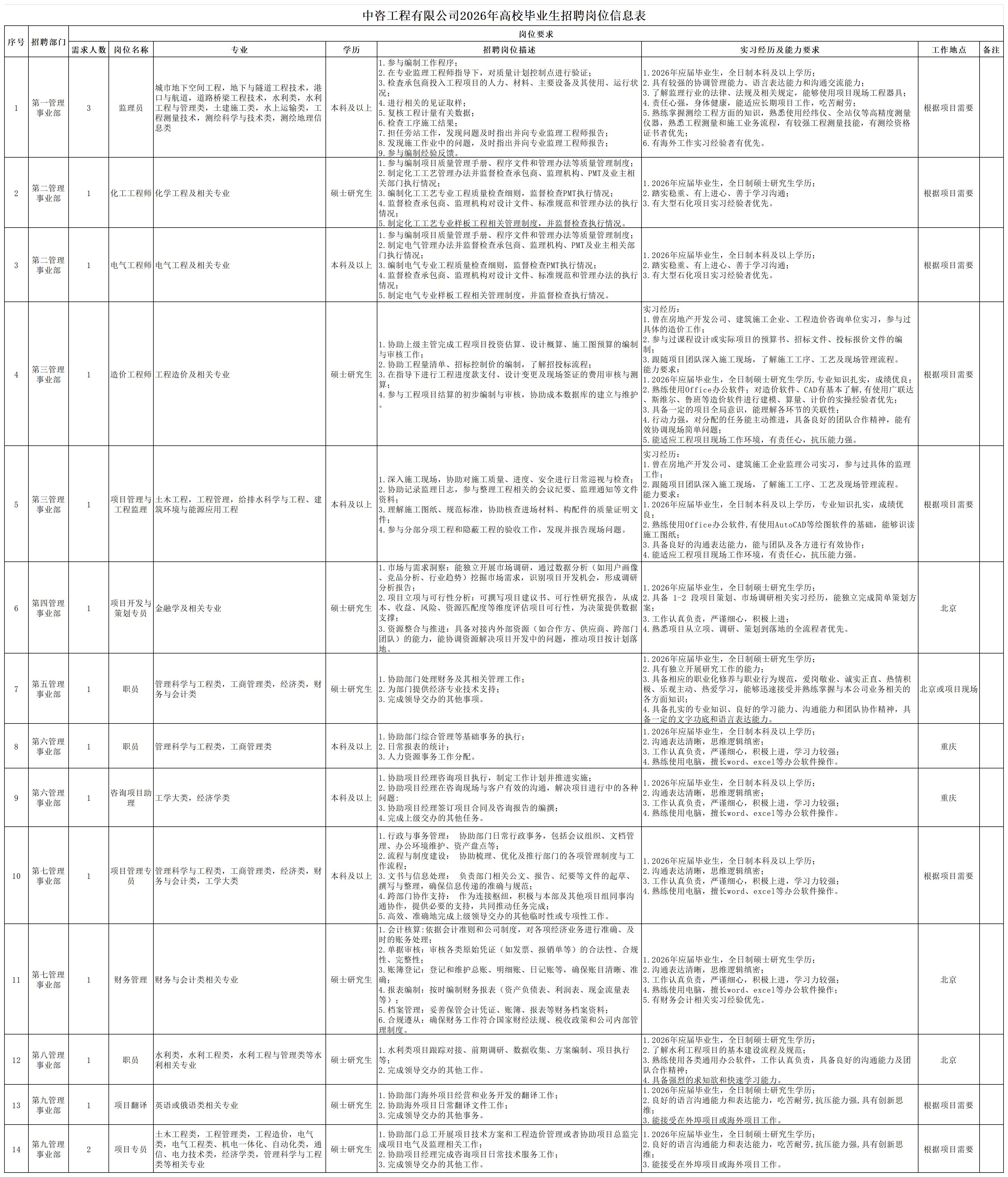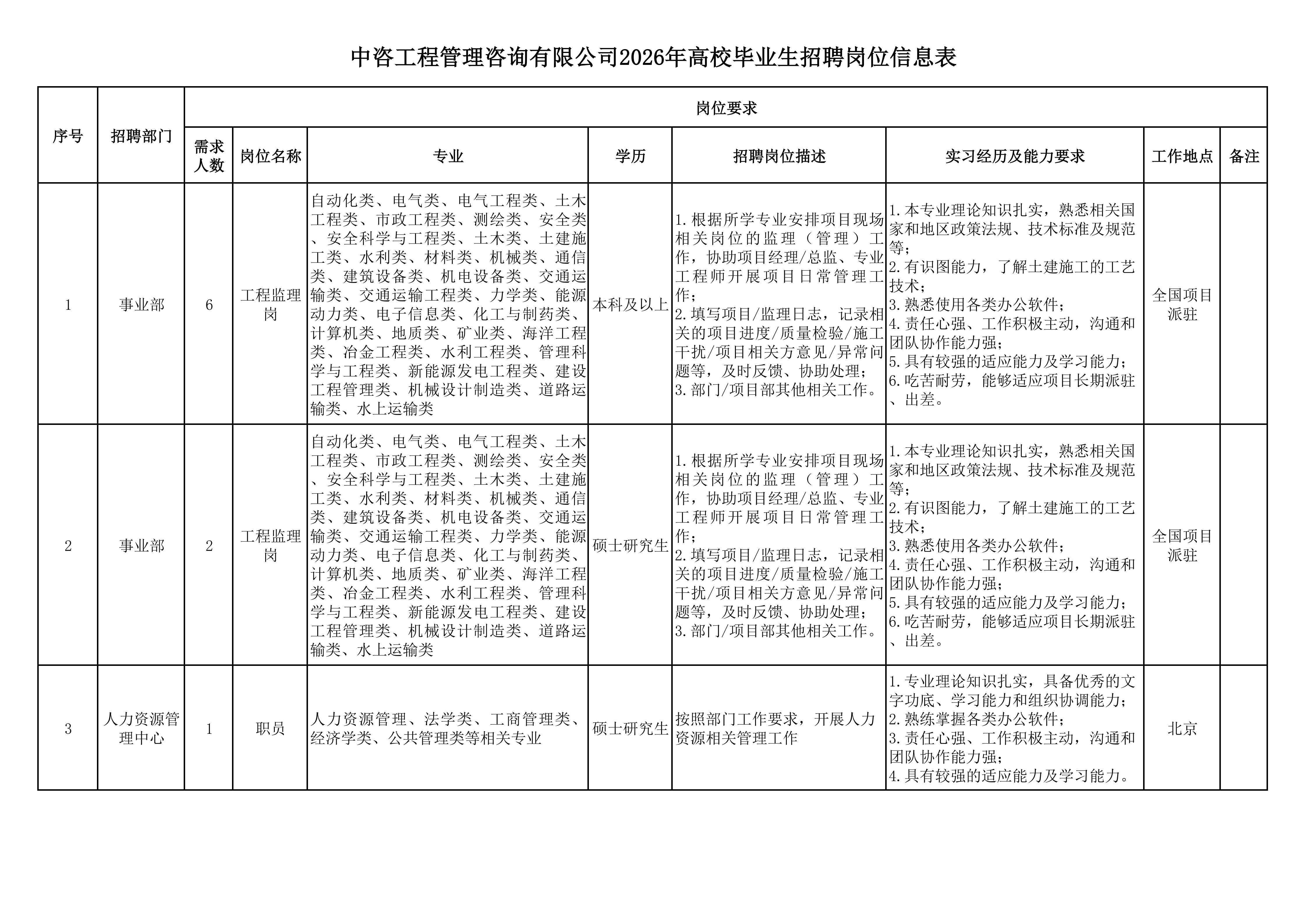 一、公司簡(jiǎn)介 中咨工程管理咨詢有限公司(簡(jiǎn)稱中咨管理)成立于1989年,是中國(guó)國(guó)際工程咨詢有限公司的核心骨干子公司,注冊(cè)資金1.55億元。現(xiàn)有各項(xiàng)資質(zhì)證書持證2800余冊(cè),中高級(jí)職稱比例超50%。 中咨管理公司是國(guó)內(nèi)從事工程管理類業(yè)務(wù)最早、規(guī)模最大、行業(yè)最廣、業(yè)績(jī)最多的企業(yè)之一,具有工程咨詢甲級(jí)資信、工程監(jiān)理綜合資質(zhì)以及設(shè)備、公路工程、地質(zhì)災(zāi)害防治工程、人民防空工程等多項(xiàng)專業(yè)監(jiān)理甲級(jí)資質(zhì),并列入政府采購(gòu)招標(biāo)代理機(jī)構(gòu)和中央投資項(xiàng)目招標(biāo)代理機(jī)構(gòu)名單。業(yè)務(wù)涵蓋工程前期咨詢、項(xiàng)目管理、項(xiàng)目代建、招標(biāo)代理、造價(jià)咨詢、工程監(jiān)理、設(shè)備監(jiān)理、設(shè)計(jì)優(yōu)化、工程質(zhì)量安全評(píng)估咨詢等項(xiàng)目全過(guò)程咨詢服務(wù),涉及房屋建筑、交通、石化、水利、電力、冶煉、礦山、市政、生態(tài)環(huán)境、通信和信息化等多個(gè)行業(yè)。業(yè)務(wù)遍布全國(guó)及全球近50個(gè)國(guó)家和地區(qū),累計(jì)服務(wù)各類咨詢管理項(xiàng)目超過(guò)1萬(wàn)個(gè),涉及工程建設(shè)投資近5萬(wàn)億元。曾榮獲56項(xiàng)中國(guó)建設(shè)工程魯班獎(jiǎng)、15項(xiàng)中國(guó)土木工程詹天佑獎(jiǎng)、64項(xiàng)國(guó)家優(yōu)質(zhì)工程獎(jiǎng)、23項(xiàng)中國(guó)鋼結(jié)構(gòu)金獎(jiǎng)以及各類省級(jí)或行業(yè)獎(jiǎng)項(xiàng)500余項(xiàng)。 經(jīng)過(guò)30余年的不懈努力,我們積累了豐富的工程管理經(jīng)驗(yàn),為各類工程建設(shè)項(xiàng)目保駕護(hù)航,“中咨管理”品牌成為行業(yè)的一面旗幟。我們崇尚簡(jiǎn)單、包容、共享的理念,秉持創(chuàng)造價(jià)值、貢獻(xiàn)社會(huì)的使命和專業(yè)創(chuàng)造精品、價(jià)值成就客戶的核心價(jià)值觀,為成為全過(guò)程工程管理咨詢的領(lǐng)先者而奮斗。優(yōu)秀的你值得更好的平臺(tái),加入我們,攜手共創(chuàng)新篇章! 二、應(yīng)聘條件 (一)2026年全日制本科及以上應(yīng)屆畢業(yè)生。 (二)年齡要求:本科生26周歲及以下(2000年1月1日后出生),碩士研究生30周歲及以下(1996年1月1日后出生)。 (三)在校就讀期間無(wú)在職工作經(jīng)歷,無(wú)社保繳納記錄和派遣落戶記錄。 (四)成績(jī)優(yōu)秀,人品端正,積極進(jìn)取,愿與公司共改革、奮進(jìn)。 (五)具備扎實(shí)的專業(yè)理論知識(shí)和良好的溝通能力,實(shí)踐能力較強(qiáng)。 (六)熟練使用各類辦公軟件。 (七)簡(jiǎn)歷需注明出生日期、生源地(即入學(xué)前戶籍所在地)。 三、應(yīng)聘程序 發(fā)布招聘公告→簡(jiǎn)歷投遞→簡(jiǎn)歷篩選→筆試→面試→確定人選并公示→發(fā)放錄用通知。 四、崗位信息 五、報(bào)名方式 本次招聘報(bào)名采取在線填報(bào)方式進(jìn)行:應(yīng)聘者請(qǐng)使用Chrome內(nèi)核瀏覽器(如:Chrome瀏覽器、360瀏覽器、百度瀏覽器、搜狗瀏覽器、UC瀏覽器等)登錄網(wǎng)站報(bào)名,網(wǎng)站鏈接:https://hcmcloud.ciecc.com.cn/recruit/#/index 或使用手機(jī)掃描二維碼: 中咨工程有限公司 一、 公司簡(jiǎn)介 中咨工程有限公司成立于2010年,是中國(guó)國(guó)際工程咨詢有限公司(簡(jiǎn)稱中咨公司)的控股子公司,由中咨公司和中國(guó)廣核電力股份有限公司合資成立。 公司作為中咨公司工程管理業(yè)務(wù)板塊的核心成員,主營(yíng)業(yè)務(wù)為全過(guò)程工程管理(咨詢)服務(wù)業(yè)務(wù),包括全過(guò)程中的各節(jié)點(diǎn)業(yè)務(wù)(1+X),業(yè)務(wù)范圍涉及石化、核電、冶金、交通和民用市政等多個(gè)領(lǐng)域行業(yè)工程項(xiàng)目的前期咨詢及咨詢管理、勘察管理、設(shè)計(jì)管理、監(jiān)理、采購(gòu)管理、造價(jià)咨詢、建造過(guò)程管理、項(xiàng)目管理(IPMT、PMC等)、項(xiàng)目代建和技術(shù)服務(wù)等。 公司以為國(guó)家、社會(huì)和股東創(chuàng)造價(jià)值為己任,以兩大股東提供的廣闊市場(chǎng)機(jī)遇和成熟先進(jìn)的管理體系為發(fā)展驅(qū)動(dòng)力,通過(guò)積極參與市場(chǎng)競(jìng)爭(zhēng),努力培育公司核心競(jìng)爭(zhēng)能力,打造一支特別能戰(zhàn)斗的具有復(fù)合型人才的專業(yè)化隊(duì)伍,矢志發(fā)展成為具備承接大中型全過(guò)程工程管理(咨詢)服務(wù)業(yè)務(wù)能力的、具有國(guó)際競(jìng)爭(zhēng)力的工程公司。 二、 應(yīng)聘條件 (一)2026年全日制本科及以上應(yīng)屆畢業(yè)生(部分崗位碩士研究生學(xué)歷),在校就讀期間無(wú)在職工作經(jīng)歷,無(wú)社保繳納記錄和派遣落戶記錄,學(xué)習(xí)成績(jī)優(yōu)良。 (二)良好的語(yǔ)言表達(dá)能力和溝通能力,執(zhí)行力強(qiáng),學(xué)習(xí)能力強(qiáng),協(xié)作能力強(qiáng)。 (三)身體健康,具有良好的職業(yè)道德修養(yǎng),具有較強(qiáng)的責(zé)任心。 (四)熟練使用常用辦公軟件,具有一定的文字功底。 (五)無(wú)違規(guī)違法記錄,無(wú)不良嗜好,身體素質(zhì)好,能吃苦耐勞,能承受較大的工作壓力。 三、 招聘程序 發(fā)布招聘公告→簡(jiǎn)歷篩選→資格審