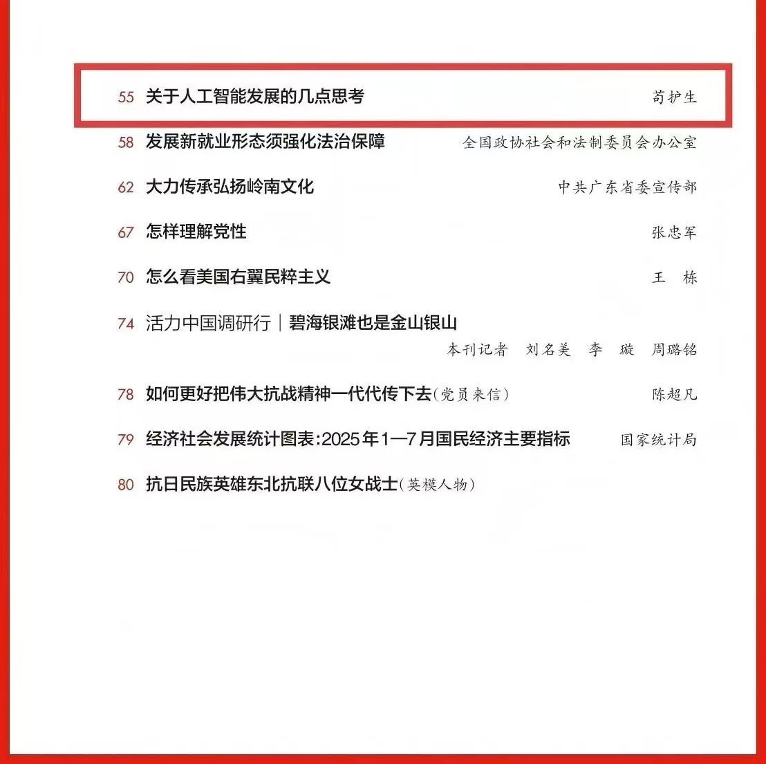 編者按:9月1日出版的2025年第17期《求是》雜志刊發(fā)公司黨委書記、董事長茍護(hù)生同志理論文章《關(guān)于人工智能發(fā)展的幾點(diǎn)思考》,文章立足全球人工智能發(fā)展浪潮,緊扣我國人工智能產(chǎn)業(yè)實(shí)際,以辯證思維深入剖析創(chuàng)新與開放、發(fā)展與安全、政府與市場、應(yīng)用與治理的內(nèi)在邏輯關(guān)系,在搶抓人工智能發(fā)展機(jī)遇、直面技術(shù)應(yīng)用風(fēng)險(xiǎn)挑戰(zhàn)中,為推動人工智能與經(jīng)濟(jì)社會深度融合、助力我國搶占全球科技競爭主動權(quán)提供了有益借鑒?,F(xiàn)予以轉(zhuǎn)載,供學(xué)習(xí)參考。 關(guān)于人工智能發(fā)展的幾點(diǎn)思考 茍護(hù)生 近年來,以大模型為代表的人工智能迎來新的發(fā)展浪潮,正以前所未有的速度深入滲透經(jīng)濟(jì)社會發(fā)展的方方面面,貼近每個人的生活和工作,深刻重構(gòu)著人類社會生產(chǎn)力和文明形態(tài)。習(xí)近平總書記指出,人工智能是新一輪科技革命和產(chǎn)業(yè)變革的重要驅(qū)動力量,將對全球經(jīng)濟(jì)社會發(fā)展和人類文明進(jìn)步產(chǎn)生深遠(yuǎn)影響。當(dāng)前,全球主要國家都在搶抓人工智能發(fā)展機(jī)遇。近日,國務(wù)院印發(fā)《關(guān)于深入實(shí)施“人工智能+”行動的意見》,明確實(shí)施“人工智能+”行動的總體要求、發(fā)展目標(biāo)和重點(diǎn)方向,為進(jìn)一步推動人工智能與經(jīng)濟(jì)社會各行業(yè)各領(lǐng)域廣泛深度融合提供了方向指引。我們要深刻領(lǐng)會習(xí)近平總書記關(guān)于人工智能的重要論述,把握好創(chuàng)新與開放、發(fā)展與安全、政府與市場、應(yīng)用與治理的辯證關(guān)系,立足產(chǎn)業(yè)發(fā)展需求,順應(yīng)治理變革趨勢,走出一條具有中國特色的人工智能發(fā)展之路。 自主創(chuàng)新與開放合作的辯證統(tǒng)一。習(xí)近平總書記強(qiáng)調(diào),“自主創(chuàng)新是開放環(huán)境下的創(chuàng)新”。這一重要論斷為處理好人工智能技術(shù)自主與全球化協(xié)作提供了根本遵循。 自主創(chuàng)新是人工智能發(fā)展的“根”,沒有核心技術(shù)的自主化,開放合作就可能淪為“依附式發(fā)展”,在關(guān)鍵領(lǐng)域受制于人。2018年以來,面對美國對人工智能和芯片等高技術(shù)產(chǎn)業(yè)的嚴(yán)密封鎖和瘋狂打壓,我國始終堅(jiān)持自主創(chuàng)新,在芯片結(jié)構(gòu)、核心算法等底層技術(shù)領(lǐng)域?qū)崿F(xiàn)突破,初步構(gòu)建了自主化的產(chǎn)業(yè)生態(tài)。例如,深度求索公司通過自主優(yōu)化算法架構(gòu),用遠(yuǎn)低于國際同類產(chǎn)品的成本,達(dá)到了相近的性能水平。再如,我國企業(yè)在激光雷達(dá)、高精度地圖等關(guān)鍵環(huán)節(jié)的自主創(chuàng)新,讓我國躋身自動駕駛領(lǐng)域領(lǐng)先國家。這些技術(shù)的突破離不開我國良好的自主創(chuàng)新條件。國內(nèi)超大規(guī)模市場是人工智能技術(shù)落地與迭代的“試驗(yàn)場”,我國擁有全球最大的數(shù)字經(jīng)濟(jì)市場,為人工智能應(yīng)用提供了豐富場景;國內(nèi)完整的產(chǎn)業(yè)鏈體系,為人工智能技術(shù)的自主發(fā)展提供了有效支撐。 自主創(chuàng)新并非“閉門造車”,堅(jiān)持開放合作才能緊跟科技發(fā)展方向,避免裹足不前或淪為“技術(shù)孤島”。在基礎(chǔ)研究領(lǐng)域,全球開源社區(qū)貢獻(xiàn)的TensorFlow、PyTorch等深度學(xué)習(xí)框架,為我國人工智能創(chuàng)新提供了底層支撐,我國也依靠大模型的開源生態(tài),打破了美國科技巨頭的封閉系統(tǒng)壟斷,為全球人工智能發(fā)展提供了中國解決方案。在高端人才方面,全球頂尖人工智能研究者分布具有分散性,需要通過國際交流集聚智慧。人工智能治理是全球性的挑戰(zhàn),需要各國攜手共進(jìn)。在大國科技博弈加劇的背景下,國際人工智能治理呈現(xiàn)多極化競爭與碎片化合作并存、技術(shù)標(biāo)準(zhǔn)爭奪與倫理價(jià)值博弈交織的復(fù)雜態(tài)勢。美國利用技術(shù)霸權(quán)塑造全球人工智能領(lǐng)導(dǎo)力,歐盟以立法監(jiān)管為導(dǎo)向鞏固在人工智能全球治理中的領(lǐng)導(dǎo)地位,我國則堅(jiān)持以開放合作的姿態(tài),主張通過“技術(shù)共享、能力共建”縮小數(shù)字鴻溝,并通過世界人工智能大會等國際平臺提出人工智能治理方略,為全球人工智能治理提供有益參考。 7月26日至28日,2025世界人工智能大會暨人工智能全球治理高級別會議在上海舉辦?!爸悄軙r(shí)代 同球共濟(jì)”的主題貫穿始終,為全球人工智能領(lǐng)域帶來一場思想與創(chuàng)新碰撞的盛宴。圖為參觀者在中國南方電網(wǎng)展區(qū)拍攝“悟空”帶電作業(yè)機(jī)器人。 新華社記者 陳浩明/攝 實(shí)踐表明,自主創(chuàng)新是開放合作的根基,開放合作是自主創(chuàng)新的助力,唯有將二者有機(jī)結(jié)合,才能讓人工智能在安全可控的前提下釋放最大價(jià)值。我國人工智能發(fā)展,必須堅(jiān)持自主創(chuàng)新與開放合作的辯證統(tǒng)一,通過國內(nèi)市場的“厚度”支撐技術(shù)創(chuàng)新的“深度”,通過國際合作的“廣度”拓展技術(shù)價(jià)值的“高度”,確保人工智能既服務(wù